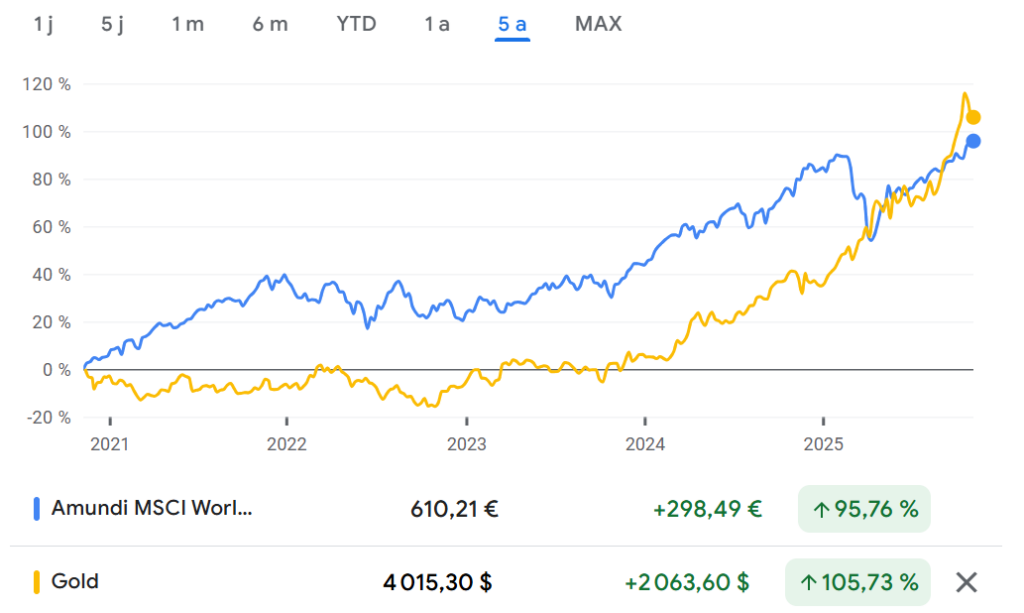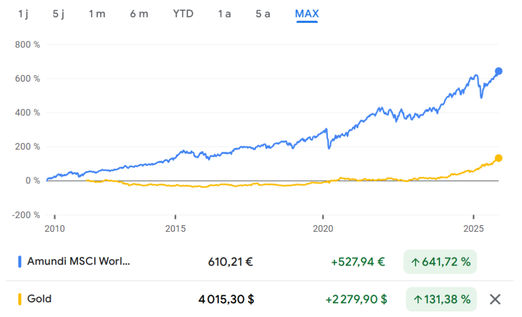 Pourtant un investisseur qui a investi depuis 5 ans dans l’or aurait battu un investisseur dans un ETF MSCI World, dividendes réinvestis.
