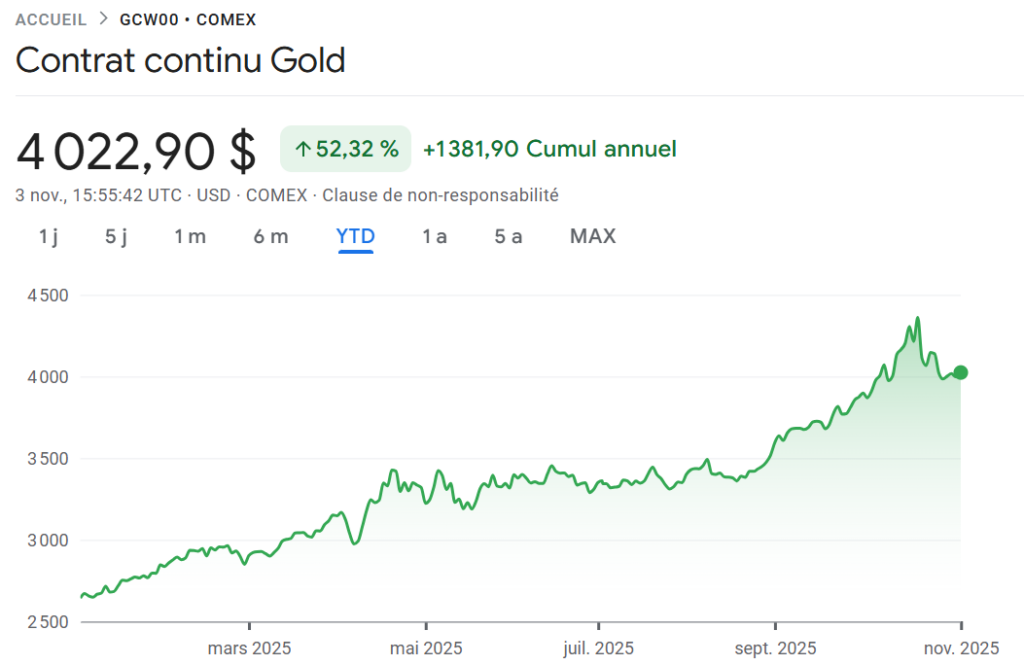 Dans ce contexte, il est bien entendu très risqué de rentrer sur ces niveaux ! L’or peut baisser. C’est un actif volatil et sensible à la spéculation. La hausse peut tout à fait se poursuivre, elle deviendra de plus en plus fragile au fur et à mesure que les acheteurs se positionneront. Toutefois une première correction a eu lieu depuis le plus haut atteint à 4359$ le 20 octobre.