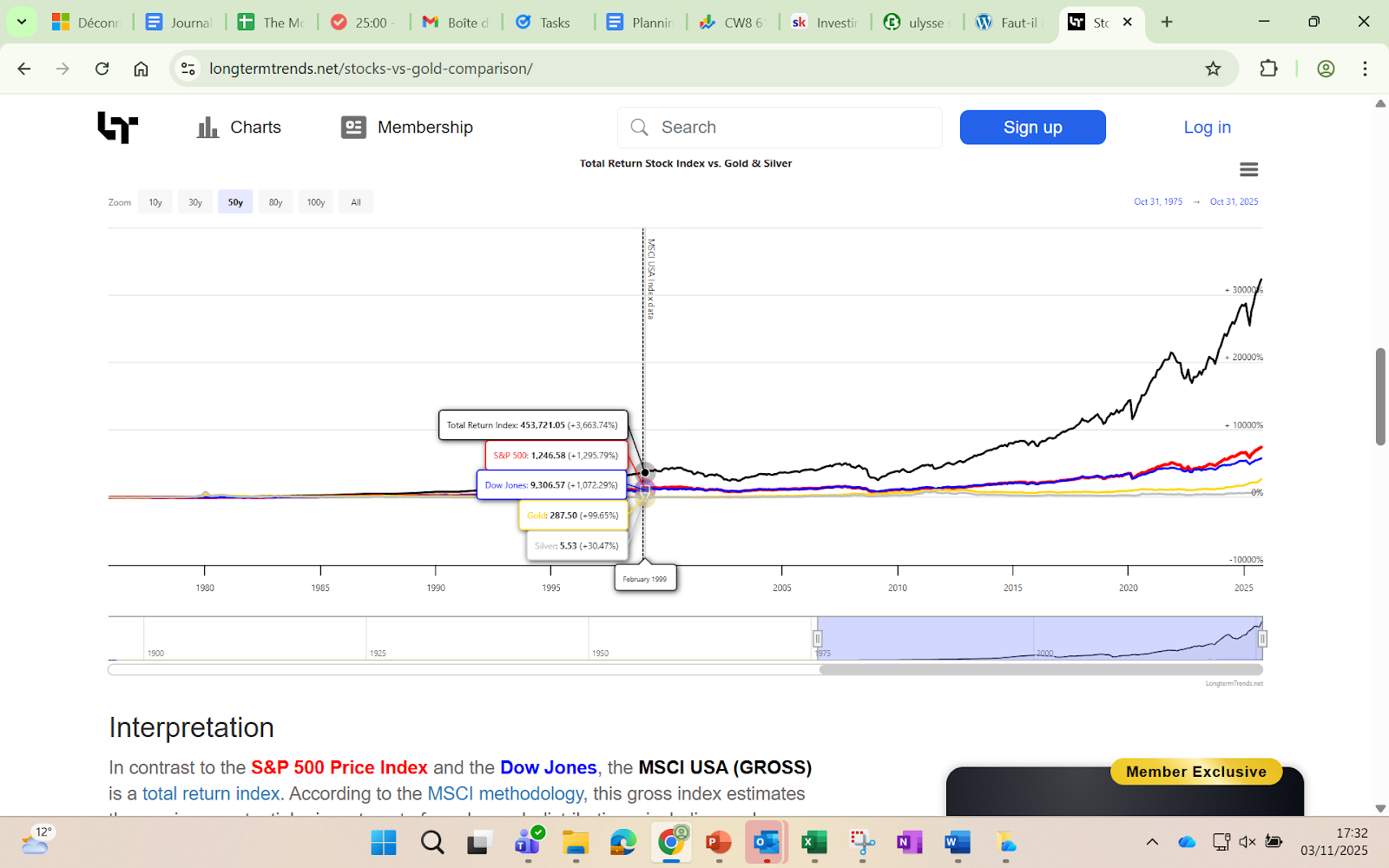 Et plus on remonte dans le temps, plus l’écart de performance est important. Entre 1975 et 2025 (50 ans), les actions (en noir) on fait x 324 contre x 28 pour l’or.
