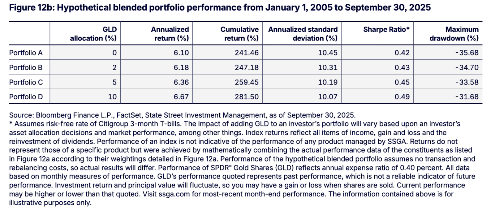La raison pour laquelle j’ai détenu de l’or à l’époque est que l’or est peu corrélé avec les actions. StateStreet a réalisé une analyse de 2005 à 2025 qui a révélé que l’ajout d’une petite allocation en or (de 2 % à 10 %) à un portefeuille augmentait le rendement tout en diminuant la volatilité et la perte maximale.