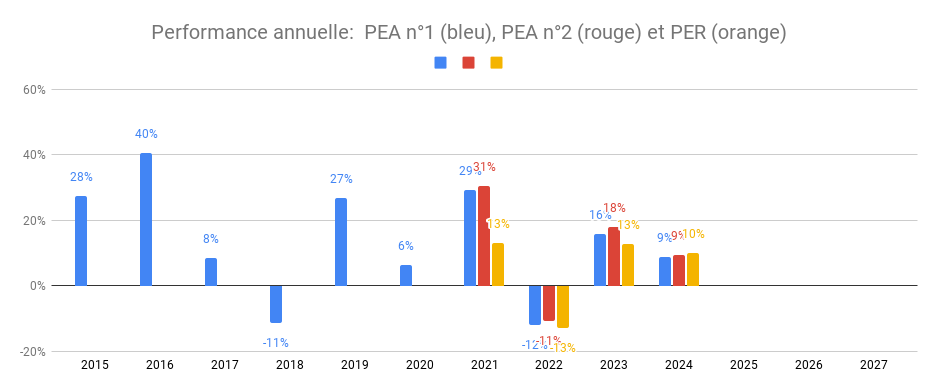 Le PEA n°1 cumule +233% de performance depuis sa création en 2014 (en bleu ci-dessous), et un TRI annuel de 12%. Le PEA n°2 a lui un TRI annuel de 14%, ayant commencé à être investi depuis mars 2020 en plein krach boursier COVID.
