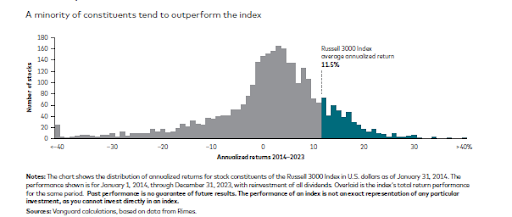 - Quelles sont vos chances d’avoir choisi un “winner”? Faibles. Selon une étude publiée par Vanguard en 2024 sur les 3000 plus grandes sociétés américaines, moins de 20% des sociétés ont battu leur indice. Soit moins d’une chance sur 5. De plus près de la moitié des sociétés ont eu une performance négative soit une chance sur 2 de perdre de l’argent alors que le marché avait fait 11.5% par an !